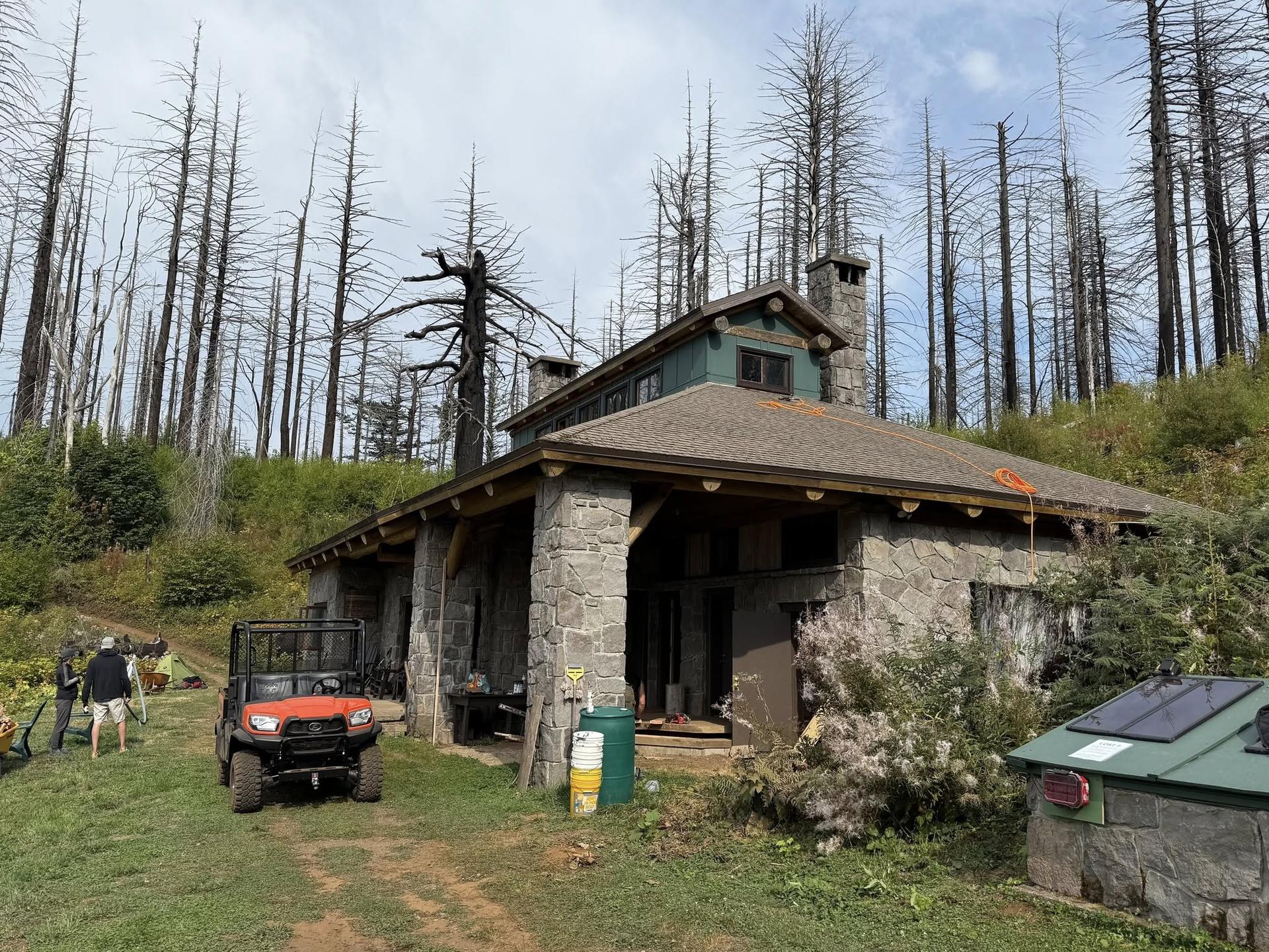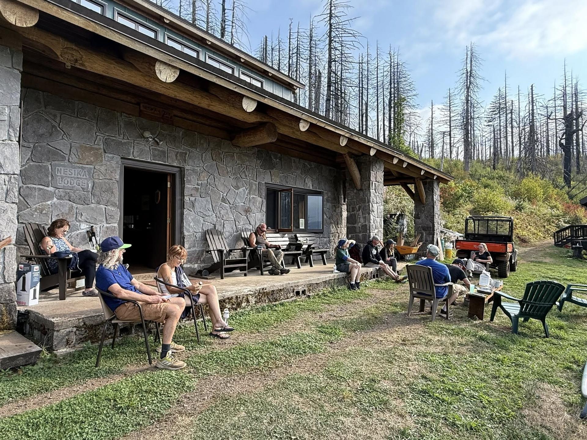 Nesika Report, Pete A lost hiker entered the lodge to seek refuge on 8/29/25 by breaking the window of the door closest to the bathrooms. The 18 year old male high school grad spent the night in the lodge. He depleted one fire extinguisher, and another is missing. He lit fires inside and out, apparently trying to send smoke signals for rescue. He left an apology note using 2 pages from theguestbook, along with his name. A police report was filed with the Multnomah County Sheriff’s Office the next day. On the work weekend, the front deck chairs and table were repaired and painted by Linda and Glen Conrad. The ramp in the wood room was restored back to its original specs after repairing the pipes below. The kitchen floor will be repaired on the next work trip. Six windows were replaced in the cupola, finishing all the broken glass repairs from the fire. An emergency charging station was set up on the propane bunker to charge lost hikers’ phones. Signage was posted to aid lost hikers who arrive at the lodge detailing how to get emergency aid, access to the lodge, and/or hike out. No money was earned as all trips were working, though $25 was collected in the coffee can.
